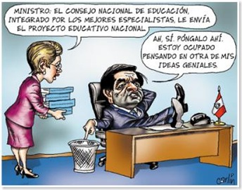Estamos en 2010, ya está publicado el Proyecto Educativo Nacional hasta 2021, tenemos un ministro de Educación cuya capacidad, nos imaginamos, lo ha llevado a ser nombrado hace poco Primer Ministro del gobierno de Alan García, sin abandonar su ministerio. José Antonio Chang, habla poco, pero ha dejado en la opinión pública la idea de haber controlado al “sindicato rojo”, SUTEP, a quien a catlogado como el chivo espiatorio causante de todos los males de la educación, según los neoliberales.